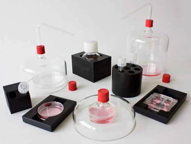 - Three glass incubator hoods for gassing culture dishes.