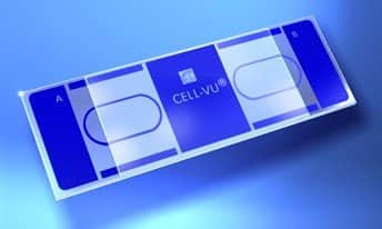 For use by casa and reticle users. For sperm counts in undiluted specimens. The CELL-VU® Cytometer consists of a standard (3 x 1″), specially-designed glass slide and a fixed coverslip. Disposal of the entire apparatus eliminates cleaning and minimizes clinician exposure to body fluids. The slide consists of two chambers (for dual determinations), each with a depth of 20 µm. This depth is optimal for sperm cells to form in a monolayer, movement is unencumbered, motility can be assessed and counts are made easily.